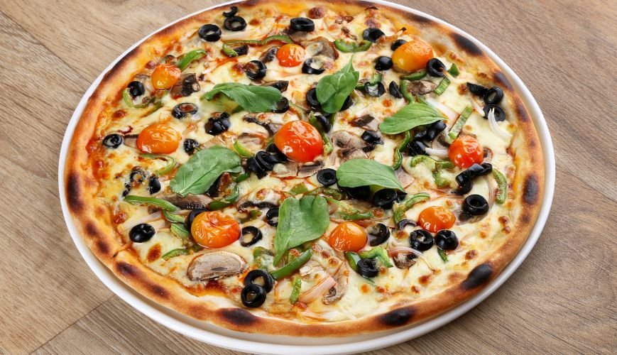 A vibrant, garden-fresh delight. This pizza combines a tomato and mozzarella base with layers of green peppers for crunch, caramelized onions for sweetness, briny olives, earthy mushrooms, and sweet cherry-cut tomatoes for a burst of freshness. A vegetarian’s dream that’s hearty, wholesome, and flavorful.